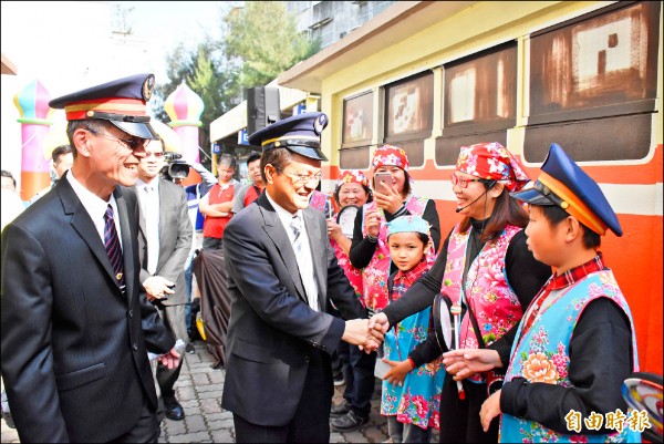 彰化縣長魏明谷(中)扮演列車長,與鐵道導覽志工握手致意。(記者陳冠備攝)