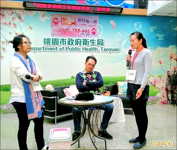 桃園市衛生局人員以狀況劇提醒,在婆媳問題中,夾在中間的男人往往也面臨痛苦與壓力,不妨找專業人員諮商協助。(記者陳昀攝)