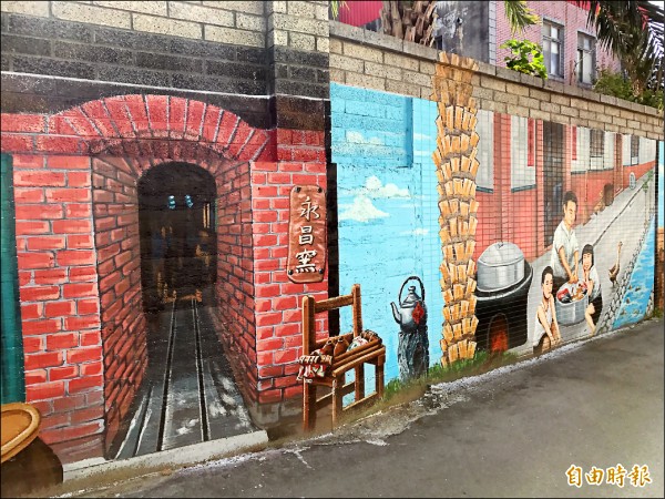永昌街牆面彩繪上3D視覺效果的柴窯、手拉坏等陶瓷產業元素,可吸引遊客拍照,地方期盼政府加速形塑陶瓷工藝園區,導入觀光商機。(記者張安蕎攝)