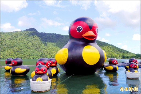 極具花蓮在地特色的「紅面鴨」家族,最大隻的Q版巨型鴨媽媽高約十五公尺,一旁還跟著十四隻可愛小鴨,聲勢浩大的「鴨鴨家族」,坐落在平靜少波的鯉魚潭畔,身後依附綠水群山,可愛討喜的外型及美景,瞬間為沉寂已久的碧綠潭水,帶進滿滿的觀光人潮。