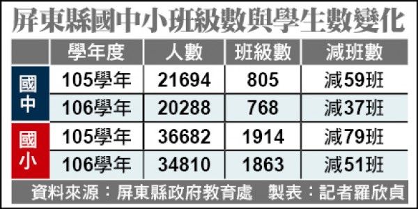 屏東縣國中小班級數與學生數變化。(資料來源:屏東縣政府教育處 製表:記者羅欣貞)