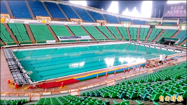 世大運設置在國體大體育館50米競賽用「組裝式游泳池」,市府決定移置平鎮高中旁的文中八用地。(記者李容萍攝)