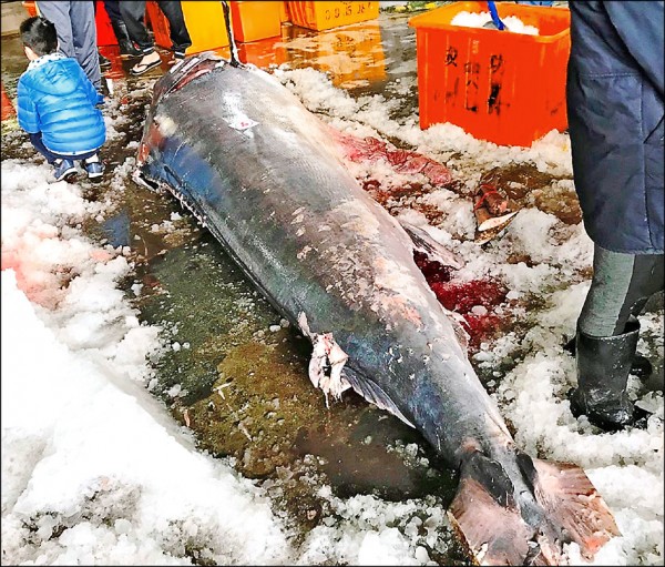 成功鎮漁民捕到五百六十三公斤的超大旗魚。(鄭國正提供)