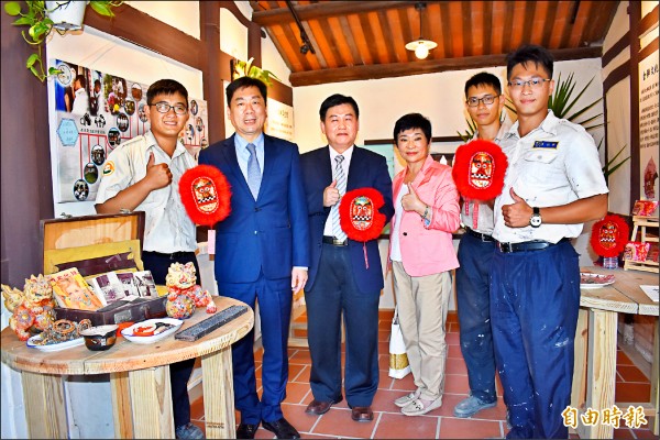 內政部次長陳宗彥(左二)、役政署長龔昶仁(左三)、西港區長陳麗娟(右三)和參與修復的替代役男出席陳家古厝竣工。(記者楊金城攝)