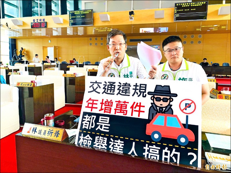 中市去年交通違規罰款近14億元,市議員林祈烽(左)、施志昌(右)譏諷市民的荷包,幾乎成了政府的提款機。(記者黃鐘山攝)