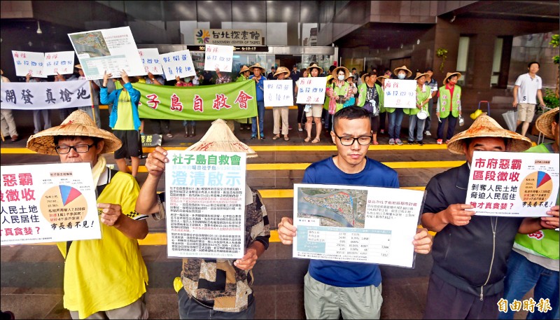 「廢除區段徵收,保障基本人權!」由社子島居民組成的社子島自救會,昨天上午第三次到市府大門口抗議,居民在現場舉起白布條、高喊口號,他們不滿開發案忽視當地聲音,痛批柯市府「假開發、真搶地!」此外,文資會昨審議社子島廿處建物是否具文資價值,由於多位居民質疑資訊不夠公開透明,文資會決議下次再審。