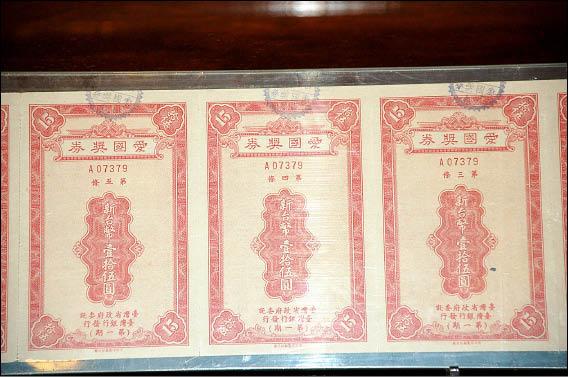 台灣發行的第一期愛國獎券,每張15元,獎額20萬元。(記者游明金攝)