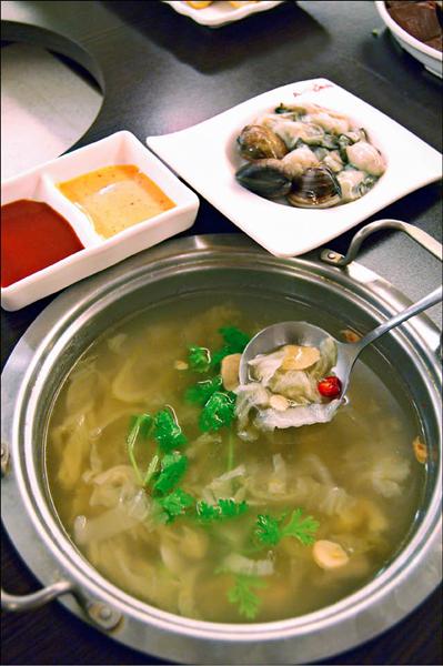 「阿官火鍋專家龍安店」的酸菜白肉鍋底,光喝湯就過癮。(記者何玉華攝)