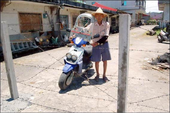 五結鄉季新村獨居老翁邱添福住家的聯外道路被設架圍籬,不能騎車自由進出,他自嘲已淪為籠中鳥。(記者江志雄攝)
