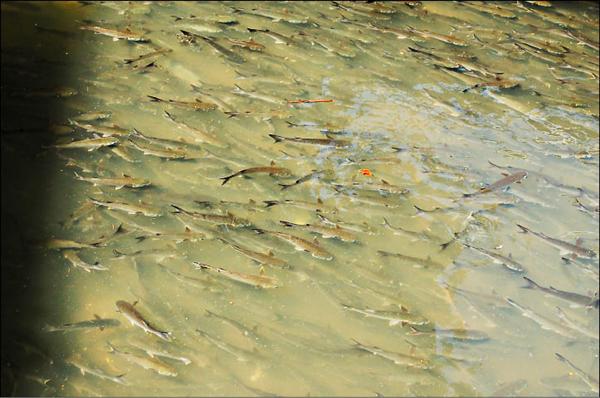 西定河出現大量烏仔魚逆流而上。(記者盧賢秀攝)
