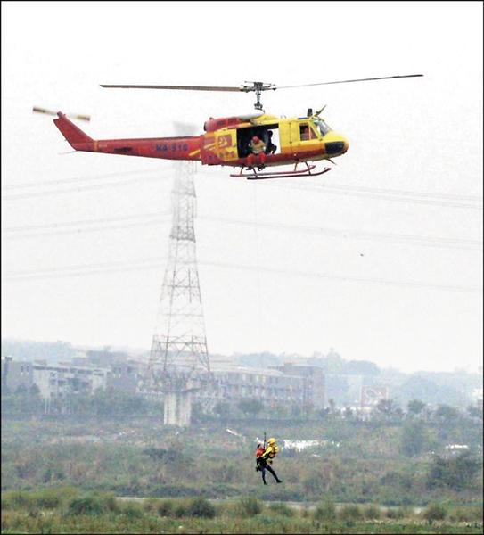 昨天在彰化市烏溪河畔舉辦的防汛救災演練,還出動直升機模擬沙洲救人,過程緊湊逼真。(記者湯世名攝)