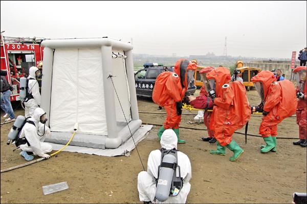 昨天在彰化市烏溪河畔舉辦的防汛救災演練中,進行化學災害演練,過程緊湊逼真。(記者湯世名攝)