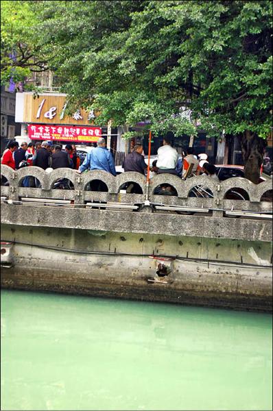 老人在田寮河岸聊天下棋,河岸地錨卻已裸露生鏽。(記者盧賢秀攝)