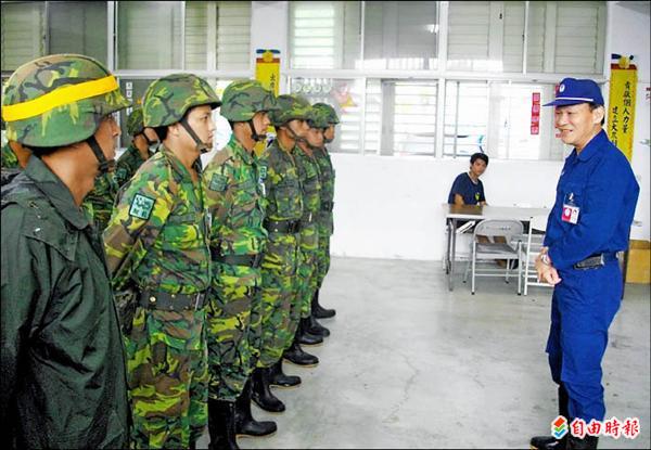 負責新秀責任分區救災指揮的空軍教準部指揮官陳添勝中將(右),正向後備新訓營的官兵進行救災任務提示。(記者游太郎攝)