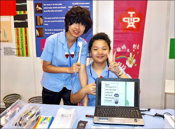 道中學吳珮伶(左)、廖宜蓁(右)發明四合一的「吸管叉子」,拿下金牌。(記者陳建志翻攝)