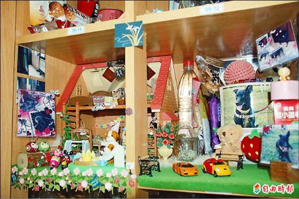 宋小姐為愛犬「ㄋㄟㄋㄟ」佈置的納骨櫃,洋房、跑車一應俱全。(記者李立法攝)