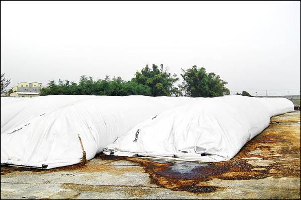 青割玉米用大塑膠袋貯存,像根特大號「大腸」,一條可貯放一百廿五公噸。(記者楊金城攝)