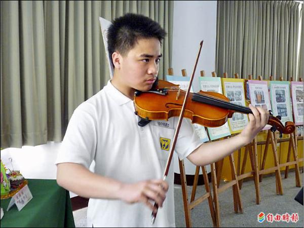 新竹縣忠孝國中全盲生彭晟源,努力克服障礙,學習口技、小提琴、烏克麗麗等,音樂才華洋溢。(記者廖雪茹攝)