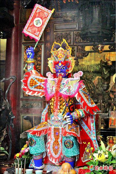 紙糊大士爺神尊昨天正式開光,神尊會微微點頭,象徵「有求必應」。(記者林宜樟攝)