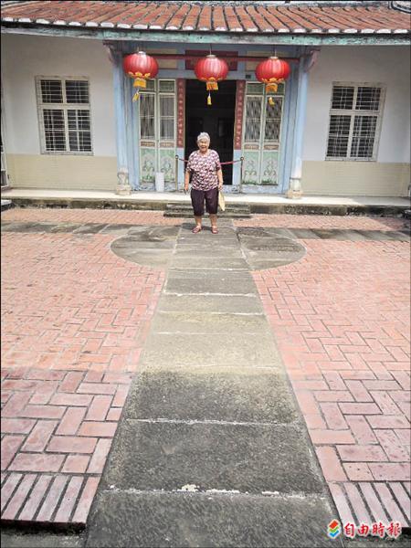 楠西鹿陶洋江家古厝宗祠前的廣場,也是電影「總舖師」的場景之一,81歲的阿嬤說,當年嫁到江家時,轎子就是停在腳下的圓圈裡。(記者劉婉君攝)