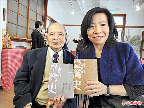 《被混淆的台灣史》作者駱芬美(右)新書發表會,父親駱雲從(左)特別前來分享。(記者廖淑玲攝)