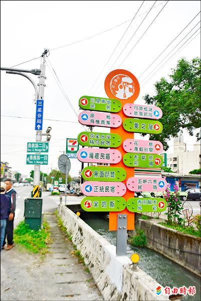 三星鄉公所以具歷史文化意涵的「五分火車頭」為意象,設計民宿指示牌。(記者朱則瑋攝)