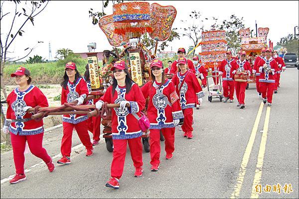下營茅港媽昨在茅港尾堡內巡香,巡香媽神轎由女轎班(前)推行、扛轎。(記者楊金城攝)