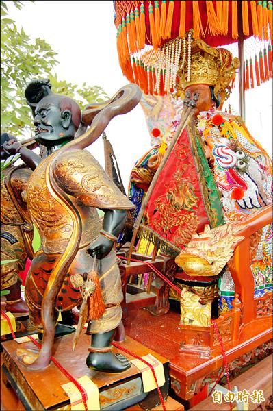 千里眼、順風耳兩位將軍在茅港媽巡香時護駕,神像是特殊的三轉體雕刻方式,象徵為媽祖瞻前顧後。(記者楊金城攝)