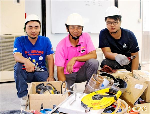 台東就業中心推出「明師高徒計畫」,資深水電師傅林芳遊(中)已招滿兩位學徒詹浩儀(左)、古瀚仁(右)。(記者張存薇攝)