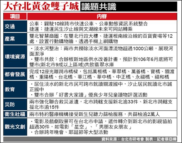 年底將卸任的台北市長郝龍斌,四年前與新北市長朱立倫喊出「大台北黃金雙子城」,其第三次委員會昨在台北市政府召開,也是郝、朱兩人共同主持最後一次會議,雙雙力推雙北合併,兩人昨也在會議達成四點共識,包括捷運民生汐止線將與文湖線銜接,不需出站轉乘,同時到一○六年讓九成雙北市民可共飲翡翠水庫的水。