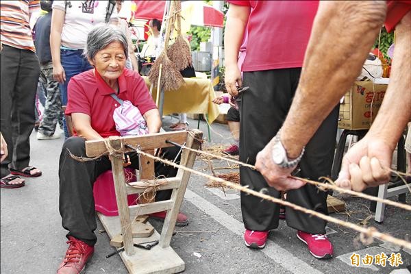 日治時期結束後,米、糖出口量銳減,加上塑膠業崛起,黃麻製品逐漸消失在籮筐會及各市場上,直到昨日崇德社區才帶著各式器具重回岡山,現場請耆老用工具編織麻繩,社區人員也拿出黃麻肉做的「屎篦」介紹:「這是早期的高級品,拿來擦屁股的!」