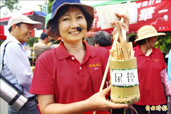 崇德社區向眾人介紹「屎篦」為早期擦屁股的衛生紙。(記者陳祐誠攝)