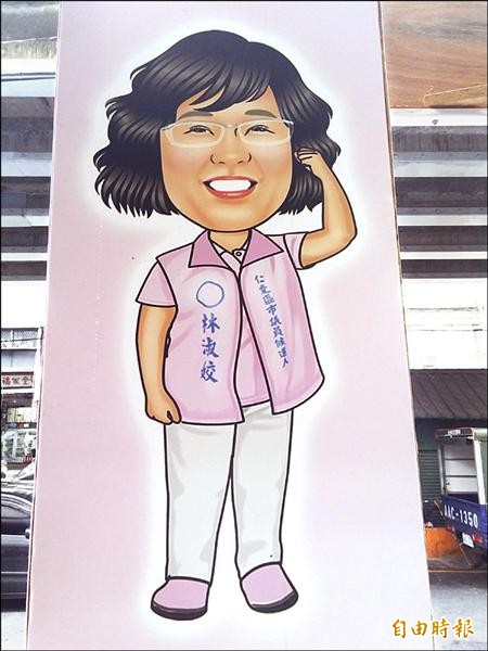 仁愛區婦女會理事長、市議員候選人林淑姣也在總部、旗幟設計Q版人像,相當具有親和力,馬上拉近與選民的距離。