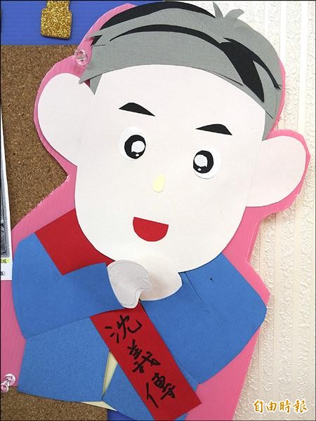 安樂區的市議員沈義傳,位在安一路上的競選總部裡,有支持者幫他製作Q版造型人物紙卡,張貼在沈義傳的政見及剪報旁,相當吸睛。