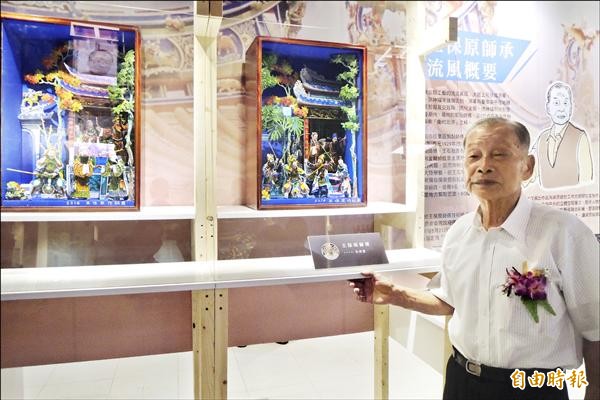 國寶級傳統剪黏匠師王保原「剪黏創作傳習工作坊」,連續三年開課,第三期昨天在蕭壠文化園區舉行結業式,師生成果展並同步開幕,展出至卅日止,八十六歲的王保原也展出今年的兩件新作「甘露寺」、「白虎堂」。
