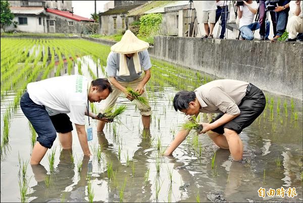 台北市長柯文哲(右)插秧初體驗。(記者游明金攝)