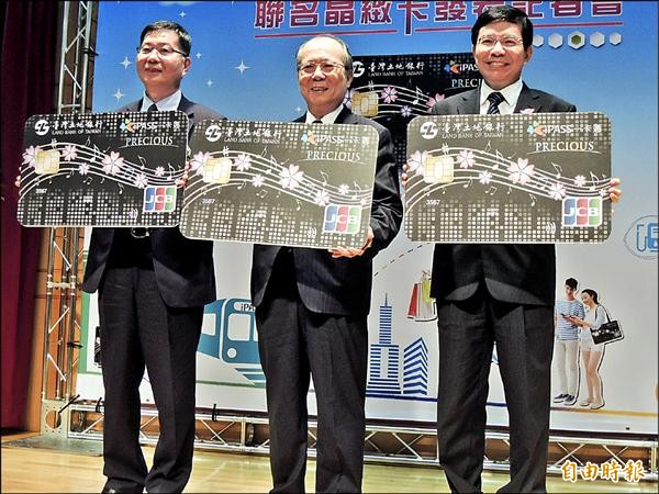 一卡通與土銀合作推出「JCB一卡通聯名晶緻卡」,圖右為一卡通董事長王國材,中為土銀總經理高明賢。 (記者葛祐豪攝)