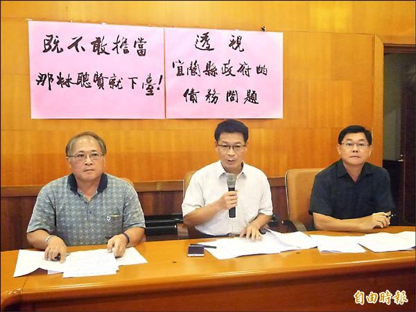 前縣長呂國華(中)要求縣長林聰賢說明宜蘭債務狀況。(記者簡惠茹攝)