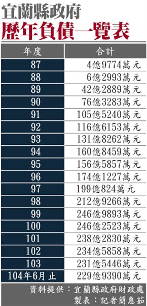 宜蘭縣政府歷年負債一覽表