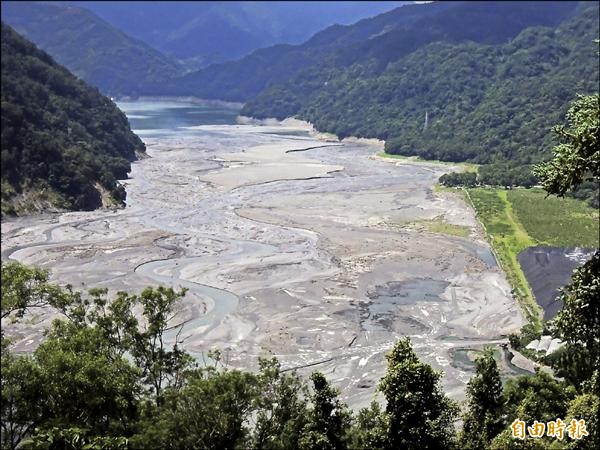 正值夏季豐水期,仁愛鄉霧社水庫仍水位偏低,露出難看的淤砂。(記者佟振國攝)