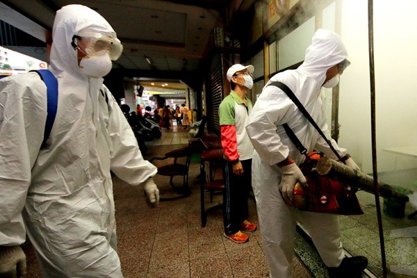 市府將動支中央補助款僱用一百八十位臨時防疫。圖為陸軍配合南市衛生人員執行消毒作業。(軍聞社提供)