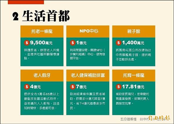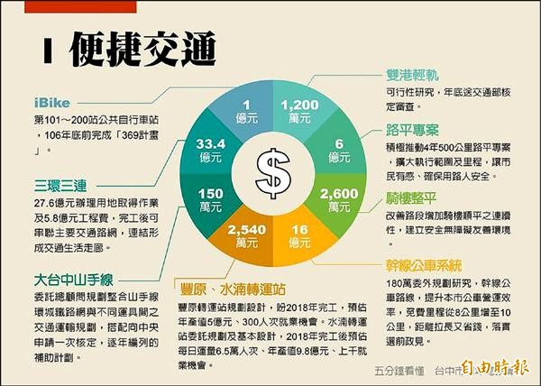 台中市明年度總預算案一一三五億元,項目多、數字雜,林佳龍在臉書分享「五分鐘看懂台中市一○五年市政總預算」,將未來一年在交通、生活、經濟、文化、農業、環境永續等面向的發展及預算規劃,分為十大區塊向市民報告。舉例來說,「便捷交通」明年編列卅三億元推動三環三連公路網、十六億打造幹線公車系統、一億元建置百座iBike租賃站;「生活首都」編列托育一條龍十七.八億、老人假牙四億、老人健保排富補助七億,都是明年施政重點項目。