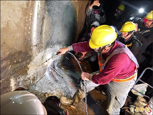 自來水處工人示範維修裂縫。(記者游蓓茹攝)