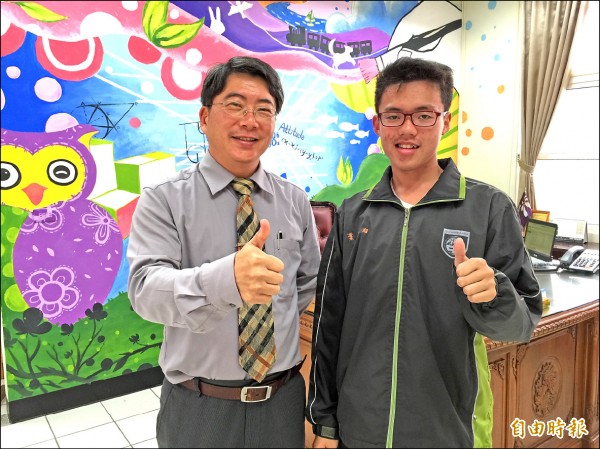 竹崎高中首位錄取台大電機工程學系的葉昶均(右)。(記者余雪蘭攝)