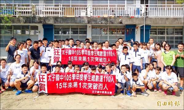 三年前,王沐錱調任太子國中時,全校學生數只有五十人,民國九十四到九十六年更慘,全校學生數只有三十七人,學區除了少子化,國一新生大多跑去讀新營南新、新東國中和私立中學,雖有太子宮捐助辦學經費,新生依然流失。