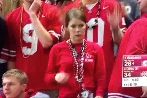 〔即時新聞/綜合報導〕在現場觀看球賽時,常常會被攝影大哥的直播鏡頭逮個正著,一般球迷看到自己出現在螢幕上,通常會熱情地揮手致意,或大喊「媽,我上電視了」。然而,美國俄亥俄州立大學這名女球迷可不這麼想…當鏡頭拍到她撫慰隔壁男球迷的頭時,她突然嚇得連忙收手,讓不少美國球迷玩味地揣測到底是什麼原因。