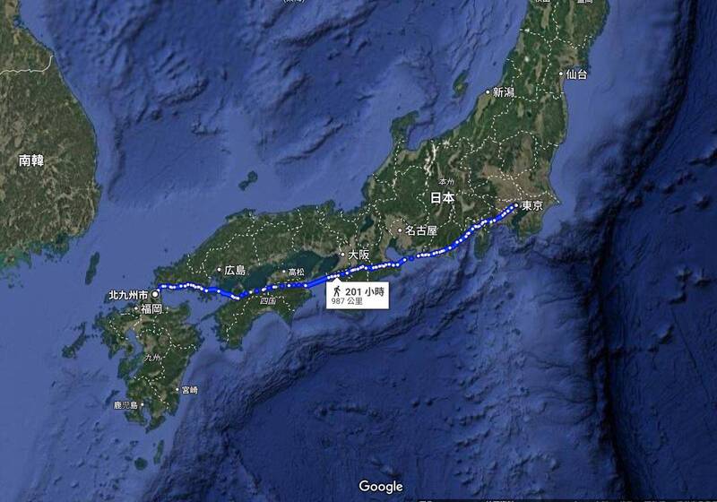 日媒指出,河野久美子與合馬晶子採取分階段方式,走完北九州市徒步走到東京都的1295公里。(圖擷取自Google maps)