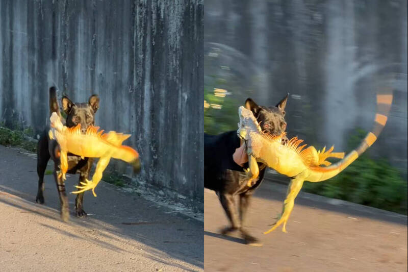 釣客目擊一隻黑狗嘴裡叼著「綠鬣蜥」戰利品,從面前飛奔而過。(本報合成,擷取自非常路亞/臉書)