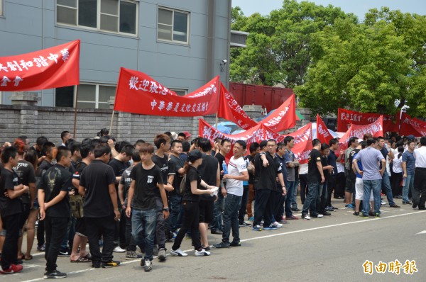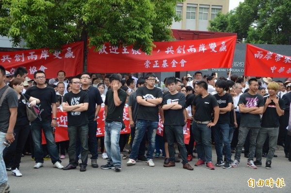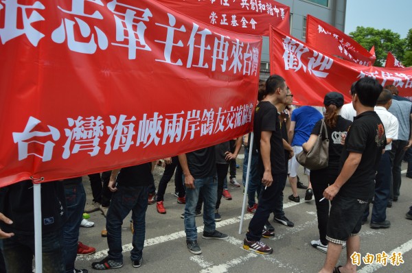 之後,他們在指揮下舉起署名「中華四海同心協會」與「台灣海峽兩岸鴿友交流協會」的歡迎紅布條,但是態度顯得頗散漫,不是閒著看熱鬧,就是三三兩兩嚼檳榔,或抽菸打打鬧鬧開玩笑,不過,這群人並沒有伺機鬧事之舉。