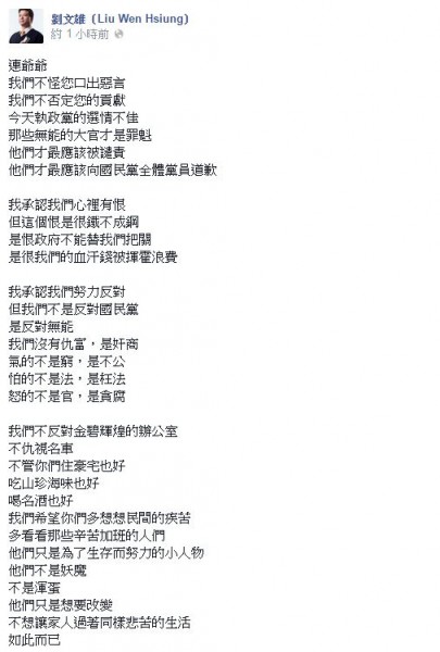 劉文雄今日也在臉書上發文,表示並不怪連爺爺口出惡言,也不否定連爺爺的貢獻,但執政黨之所以選情不佳,是由於黨內無能的大官。並表示恨鐵不成鋼,恨政府為何不能替人民把關,恨政府浪費人民血汗錢。他並不反對國民黨,但他反對無能,也並不仇富,而是氣奸商、不公、枉法、貪腐,還說「希望你們多想想民間疾苦,他們只是為了生存而努力的小人物,他們不是妖魔,不是渾蛋,他們只是想要改變,不想讓家人過著同樣悲苦的生活,如此而已」。